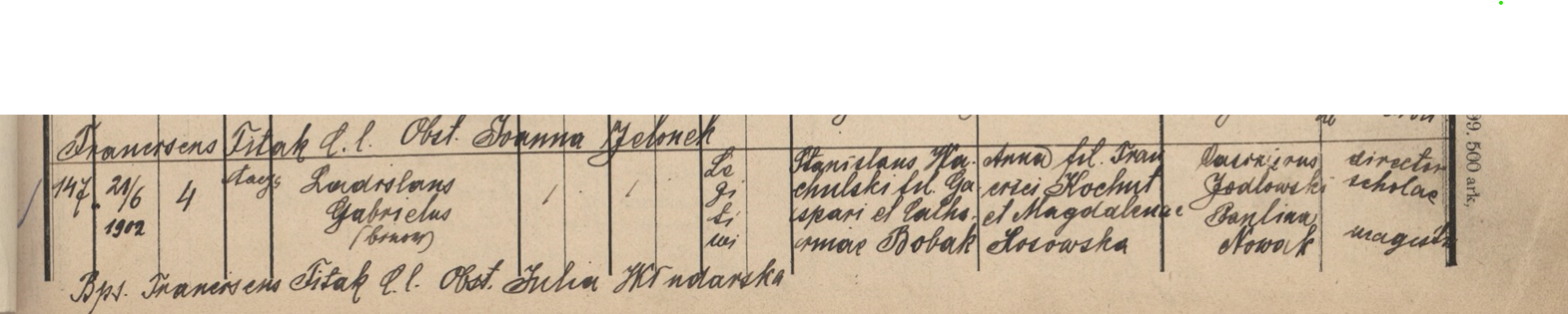 - Władysław Gabriel ur. 1902 r., ochrzczony w Krakowie-Podgórzu (par. Św. Józefa)