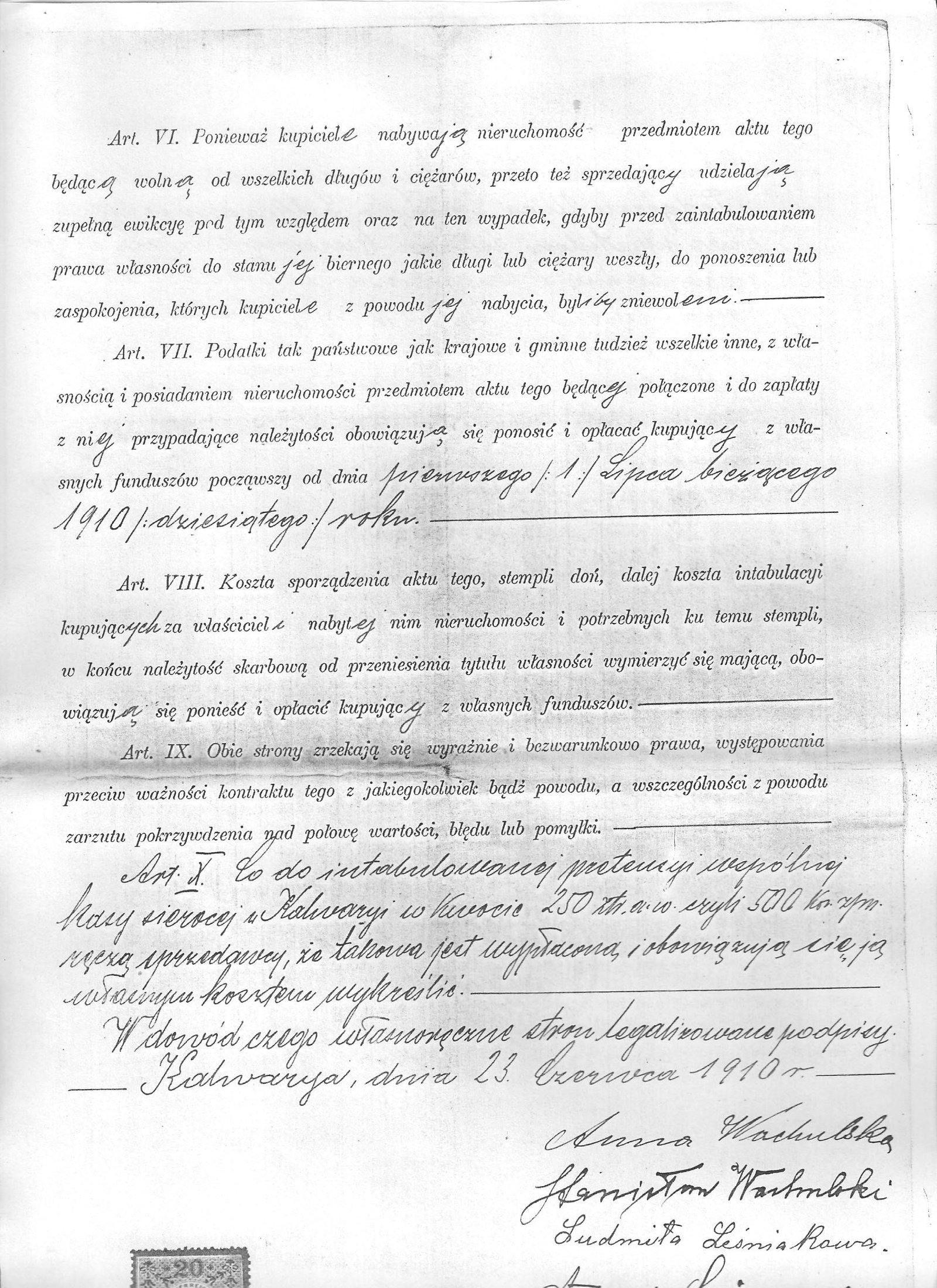 Art. V. Sprzedający zezwalają niniejszem, aby kupiciele na podstawie aktu tego zaintabulowani zostali za właścicieli sprzedanej aktem tym, w Art. II. poszczególnionej dotąd ich własność stanowiącej nieruchomości, a zatem aby prawo własności całej realności lk. i lwh. 170 gm. kat. Brody w ich miejsce na rzecz p. p. Antoniego i Ludmiły małż. Leśniaków po połowie zaintabulowano(4)Zaintabulowanie to pojęcie pochodzące z łaciny (tabula – tablica, księga). Oznacza ono dokonanie prawomocnego wpisu do ksiąg wieczystych. W tamtym czasie samo podpisanie umowy u notariusza nie czyniło jeszcze nikogo właścicielem w pełnym tego słowa znaczeniu – dopiero „zaintabulowanie”, czyli wpis w sądzie, oficjalnie przenosiło własność na kupujących., jak również aby prawo własności posiadłości lwh. 242 gm. kat. Kalwarya w miejsce Franciszka Kohouta na rzecz p. p. Antoniego i Ludmiły małż. Leśniaków po połowie zaintabulowano, do czego obowiązują się sprzedawcy do 6 miesięcy od dzisiaj dostarczyć potrzebnych dokumentów i dają w tym względzie kupicielom osobne zabezpieczenie.
