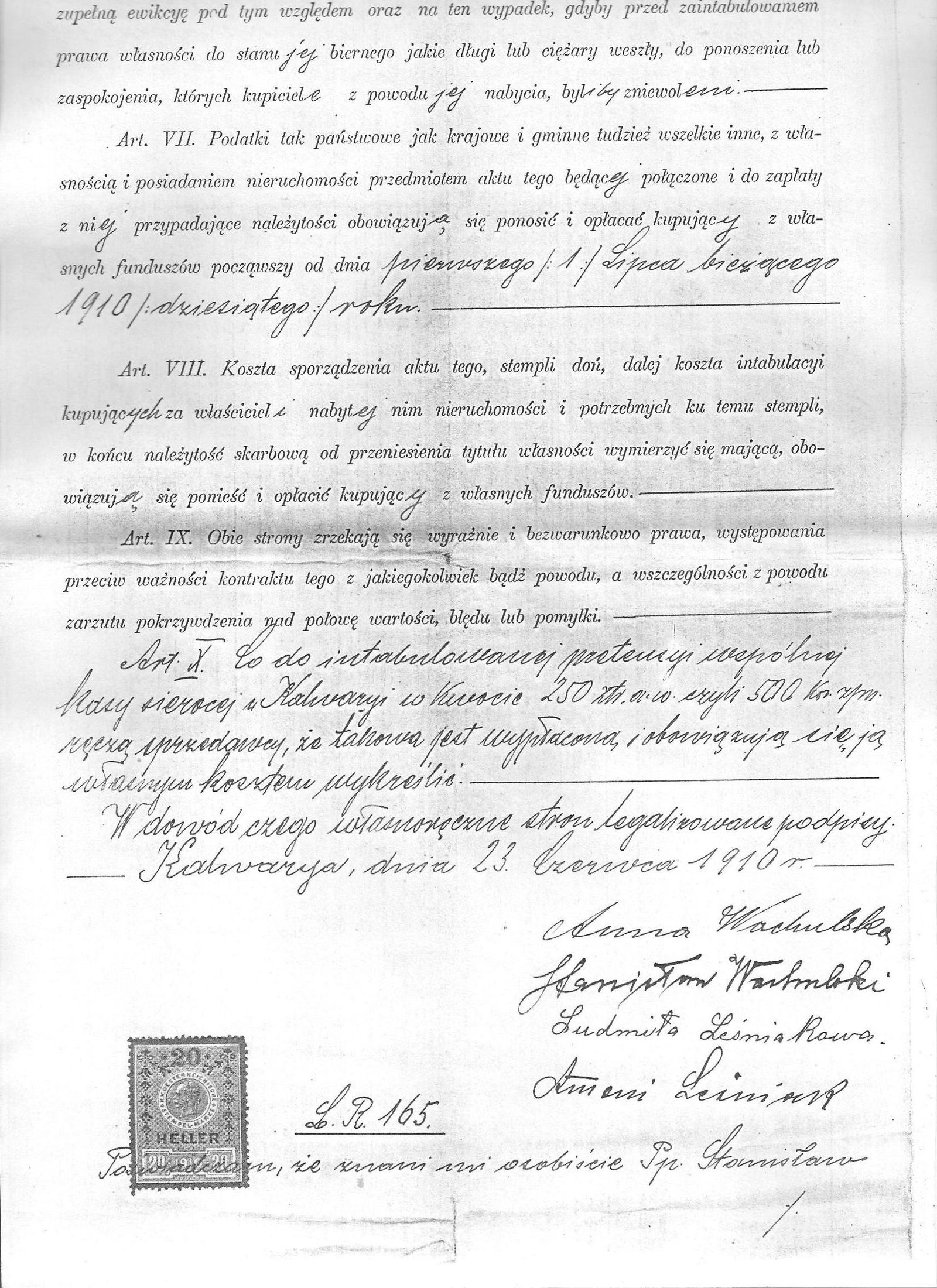 Art. II. Na tej więc podstawie p. p. Stanisław i Anna małż. Wachulscy sprzedają niniejszem p. p. Antoniemu i Ludmile małż. Leśniakom na ich wspólną po połowie wieczystą i niczem nieograniczoną własność, całą tę realność lk. i lwh. 170 gm. kat. Brody z przynależną i ich własność stanowiącą posiadłością lwh. 242 gm. kat. Kalwarya a to tak, jak nieruchomość tę sami dotąd posiadali i używali z wszelkiemi prawami do nieruchomości tej przywiązanemi i właścicielom przysługującemi, dalej z wszelkiemi uprawnieniami nic z takowej ani dla siebie, ani dla osób trzecich nie wyłączając, ani nie zastrzegając, i ze wszystkiem tem, co z ustawy, natury rzeczy i przeznaczenia, przynależność nieruchomości tej stanowi, a oni nieruchomość tę na własność kupują.