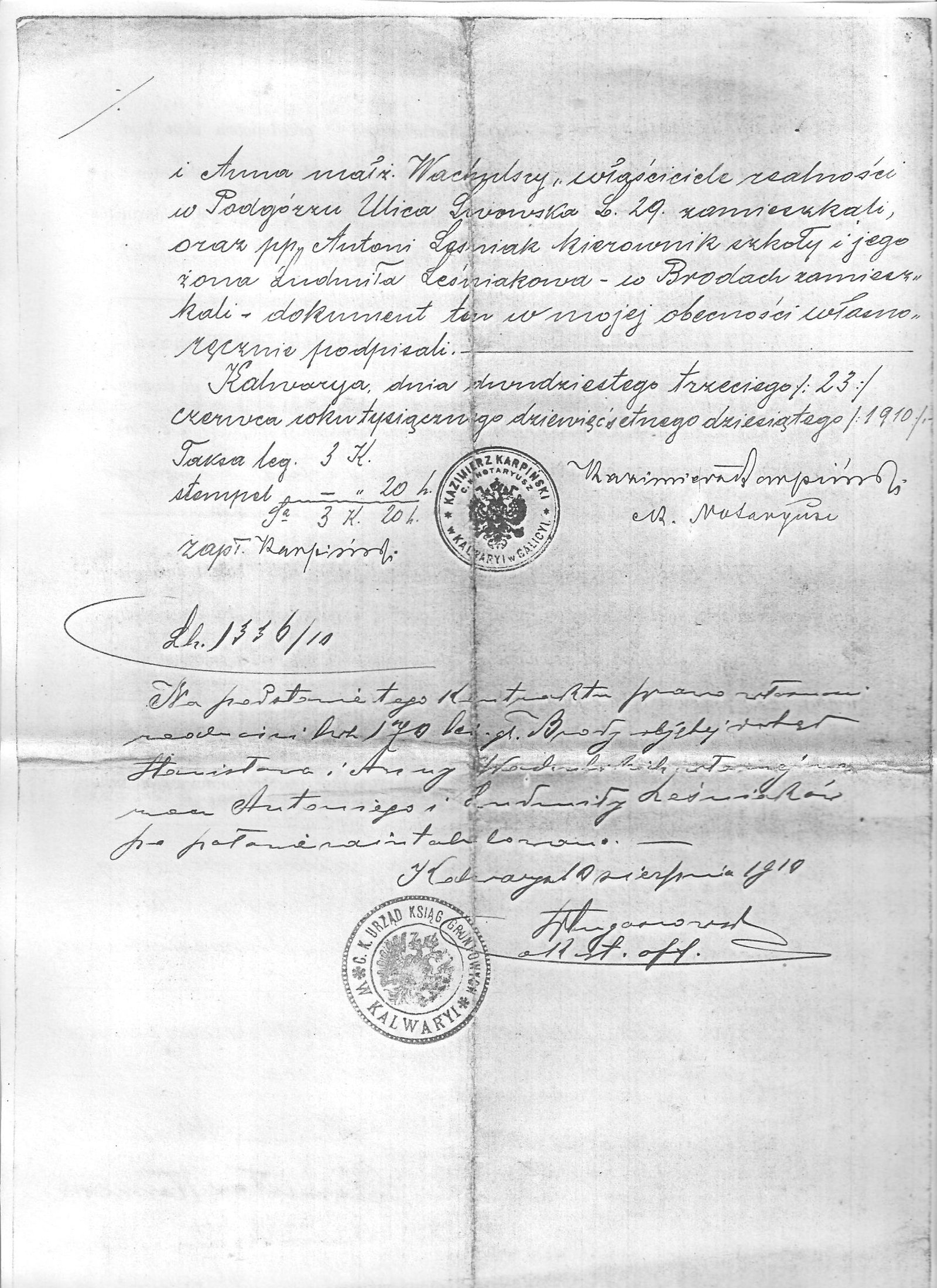 Poświadczam, że znani mi osobiście pp. Stanisław i Anna małż. Wachulscy, właściciele realności w Podgórzu Ulica Lwowska L. 29 zamieszkali, oraz p. p. Antoni Leśniak kierownik szkoły i jego żona Ludmiła Leśniakowa — w Brodach zamieszkali — dokument ten w mojej obecności własnoręcznie podpisali.