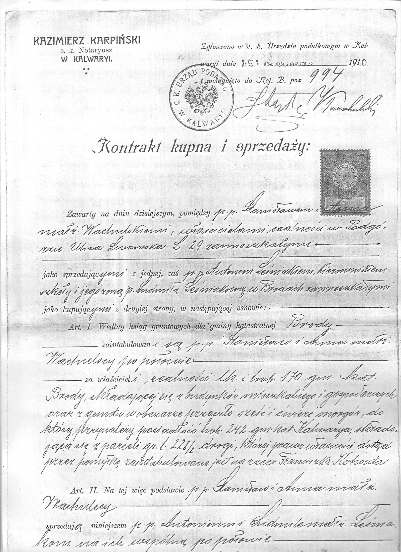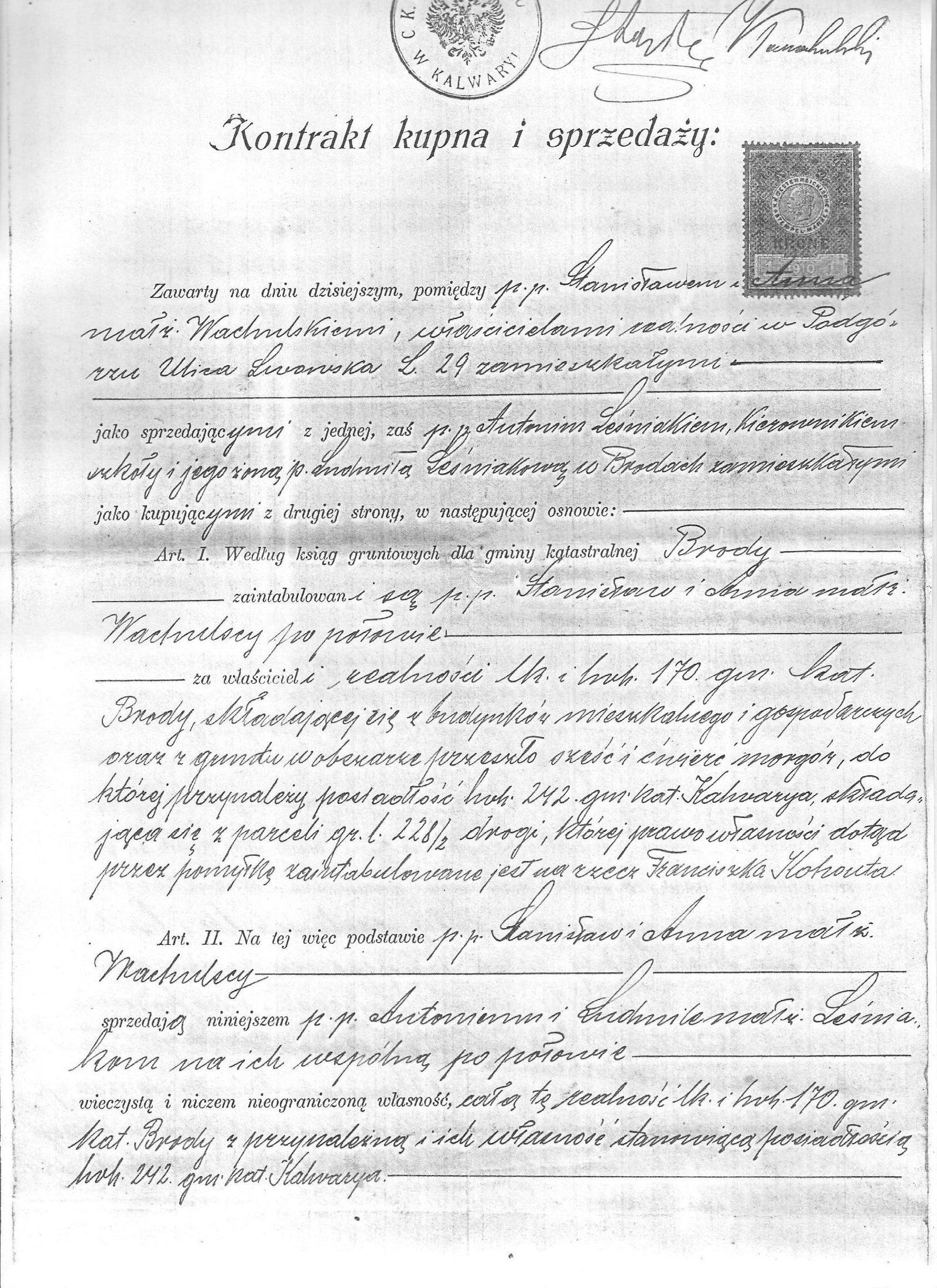Zawarty w dniu dzisiejszym, pomiędzy p. p. Stanisławem i Anną małż. Wachulskiemi, właścicielami realności w Podgórzu Ulica Lwowska L. 29 zamieszkałymi — jako sprzedającymi z jednej, zaś p. p. Antonim Leśniakiem, kierownikiem szkoły i jego żoną p. Ludmiłą Leśniakową w Brodach zamieszkałymi — jako kupującymi z drugiej strony, w następującej osnowie: