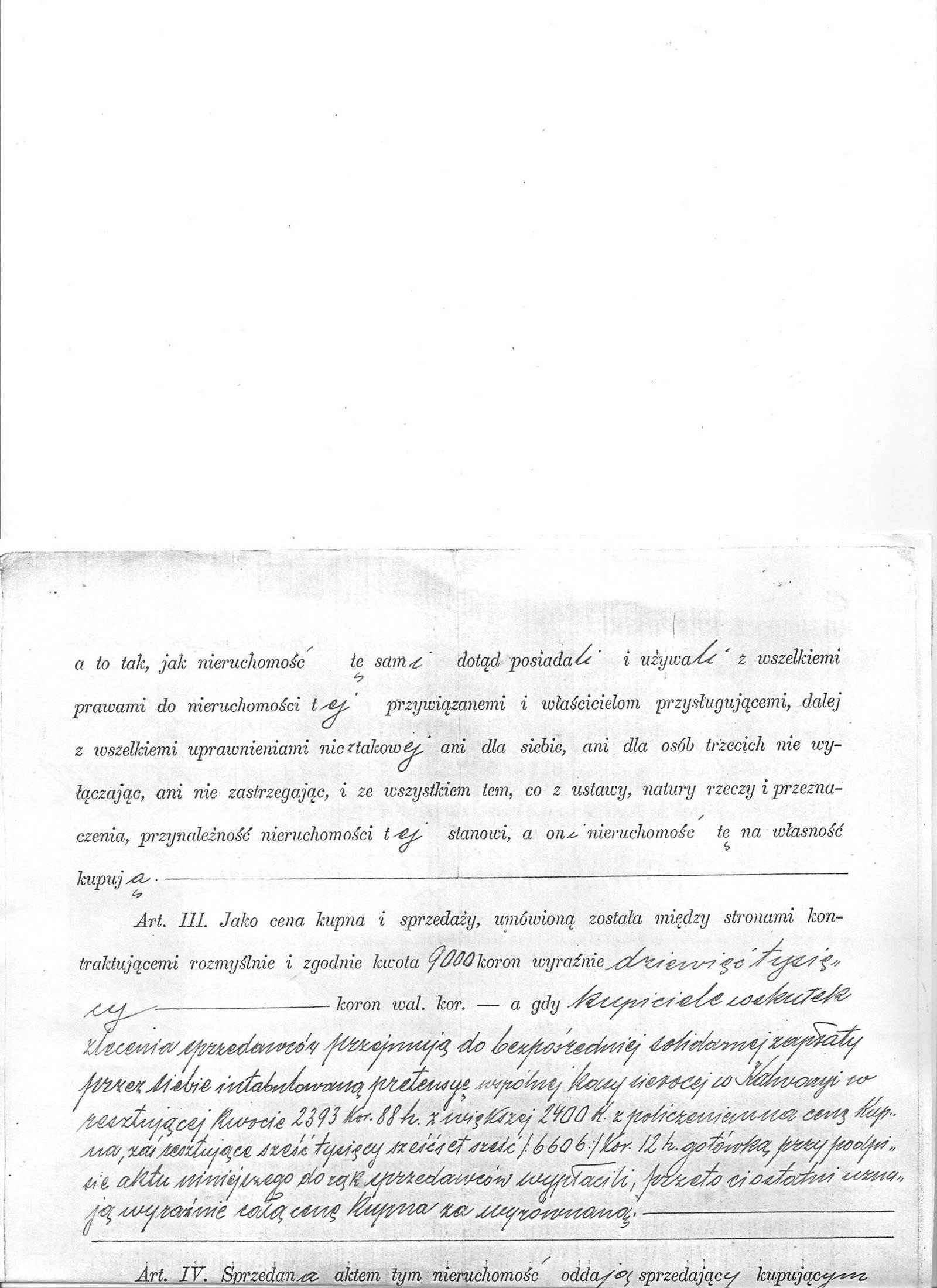 Art. III. Jako cena kupna i sprzedaży, umówioną została między stronami kontraktującemi rozmyślnie i zgodnie kwota 9000 koron wyraźnie dziewięć tysięcy koron wal. kor. — a gdy Kupiciele wskutek zlecenia sprzedawców przyjmują do bezpośredniej solidarnej zapłaty przez siebie intabulowaną pretensję wspólną kasy sierocej w Kalwaryi(3)Kasa sieroca – była to instytucja finansowa (rodzaj banku), która zarządzała majątkami osób małoletnich (sierot) oraz udzielała pożyczek pod zastaw nieruchomości. Fakt, że w kontrakcie widnieje dług wobec tej kasy, oznacza, że na nieruchomości Wachulskich ciężyła hipoteka, którą Leśniakowie musieli spłacić w ramach ceny zakupu. w resztującej kwocie 2393 kor. 88 h. z większej 2400 k. z policzeniem na cenę kupna, zaś resztujące sześć tysięcy sześćset sześć /:6606:/ kor. 12 h. gotówką przy podpisie aktu niniejszego do rąk sprzedawców wypłacili, przeto ci ostatni uznają wyraźnie całą cenę kupna za wyrównaną.