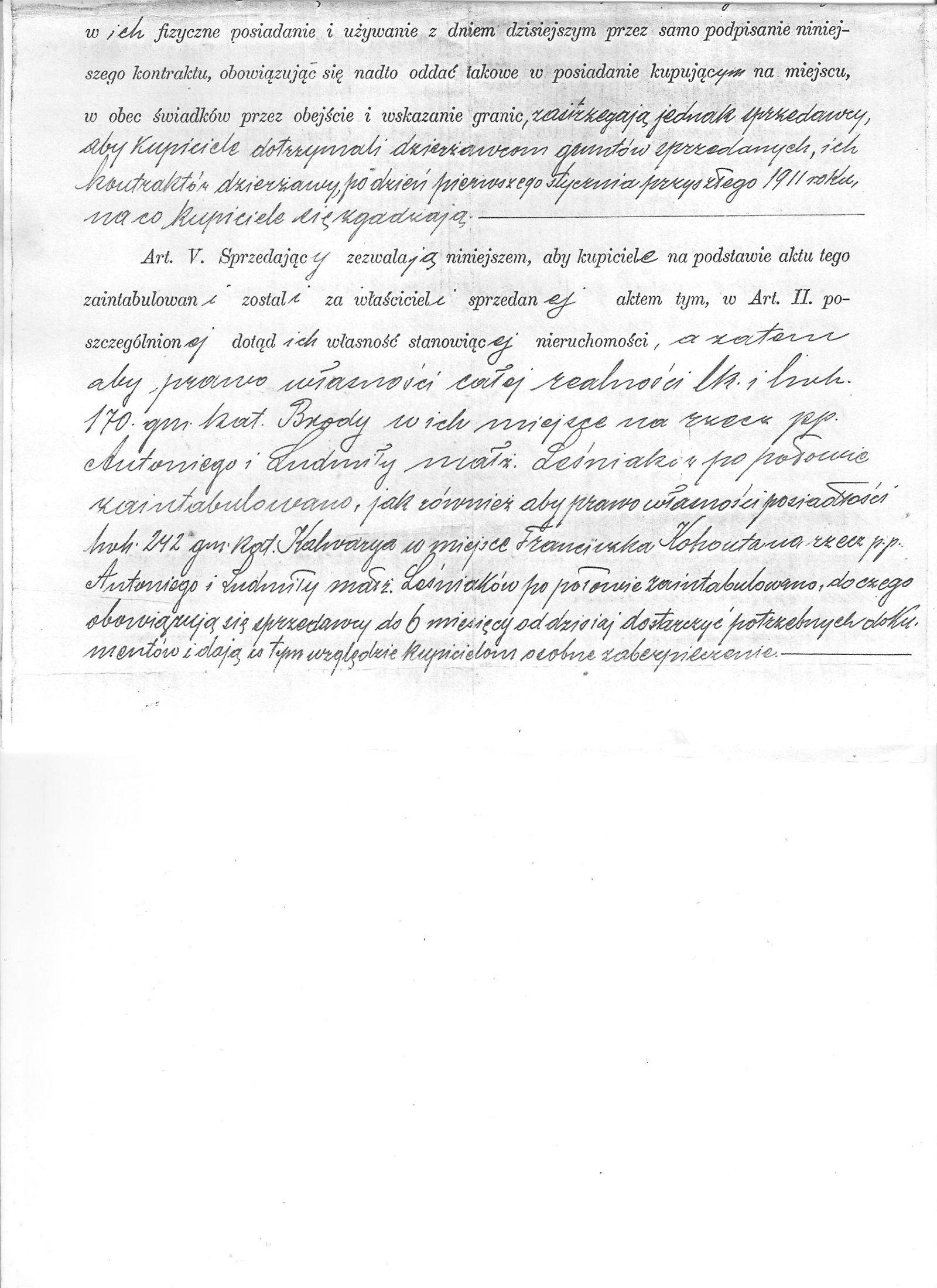 Art. IV. Sprzedaną aktem tym nieruchomość oddają sprzedający kupującym w ich fizyczne posiadanie i używanie z dniem dzisiejszym przez samo podpisanie niniejszego kontraktu, obowiązując się nadto oddać takowe w posiadanie kupującym na miejscu, w obec świadków przez obejście i wskazanie granic, zastrzegają jednak sprzedawcy, aby kupiciele dotrzymali dzierżawcom gruntów sprzedanych, ich kontraktów dzierżawy, po dzień pierwszego stycznia przyszłego 1911 roku, na co kupiciele się zgadzają.