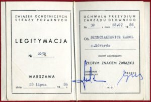 Legitymacja Nr 2050 z dn. 28 lipca 1986 r. Warszawa – Złoty Znak Związku przyznany uchwałą Prezydium Zarządu Głównego Związku Ochotniczych Straży Pożarnych w Warszawie.