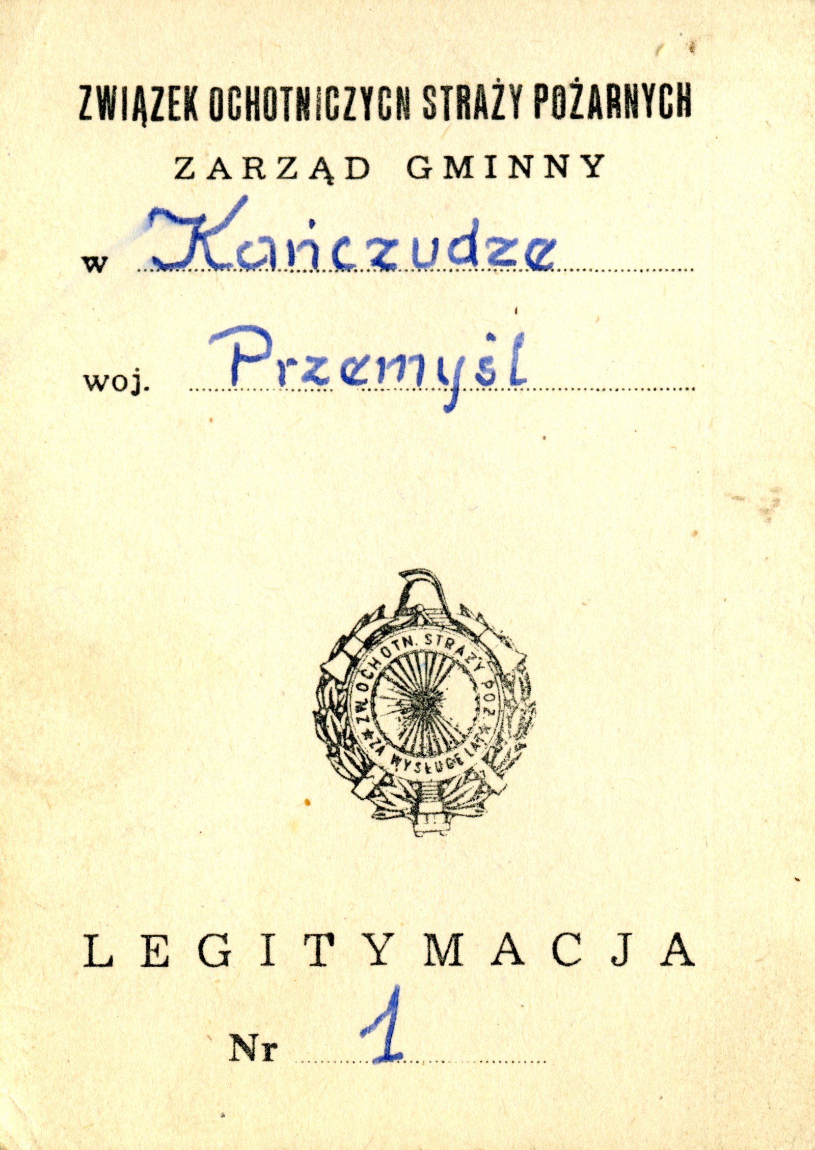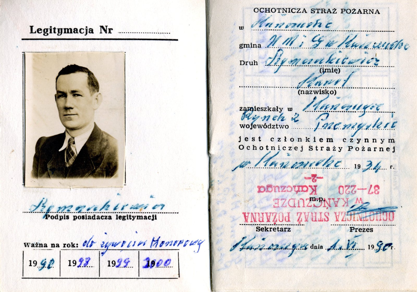 Legitymacja członkowska z dn. 1 czerwca 1990 r. Ochotniczej Straży Pożarnej w Kańczudze.