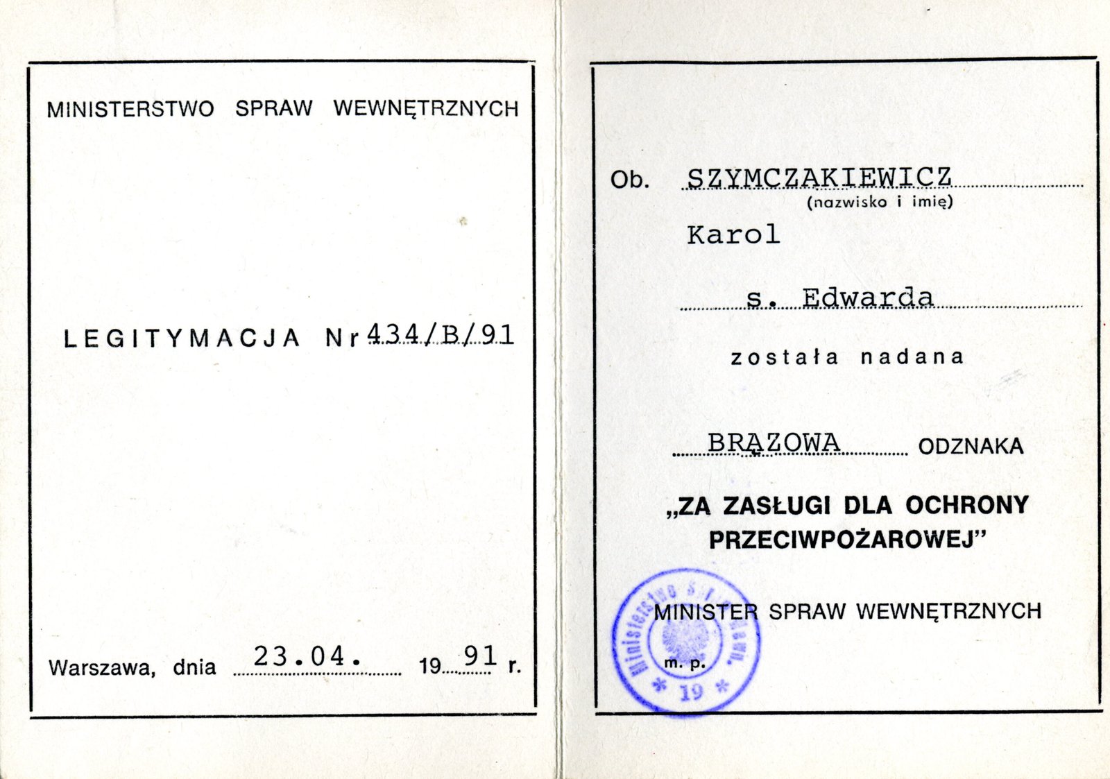 Legitymacja Nr 434/B/91 z dn. 23 kwietnia 1991 r. Warszawa – Brązowa Odznaka Za Zasługi Dla Ochrony Przeciwpożarowej nadana przez Ministra Spraw Wewnętrznych.