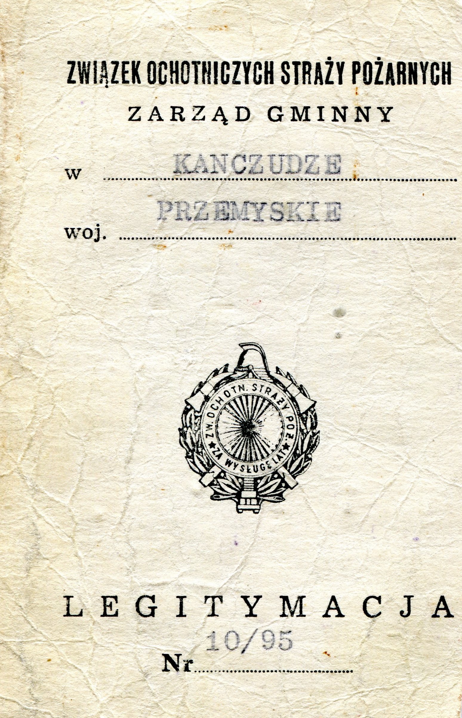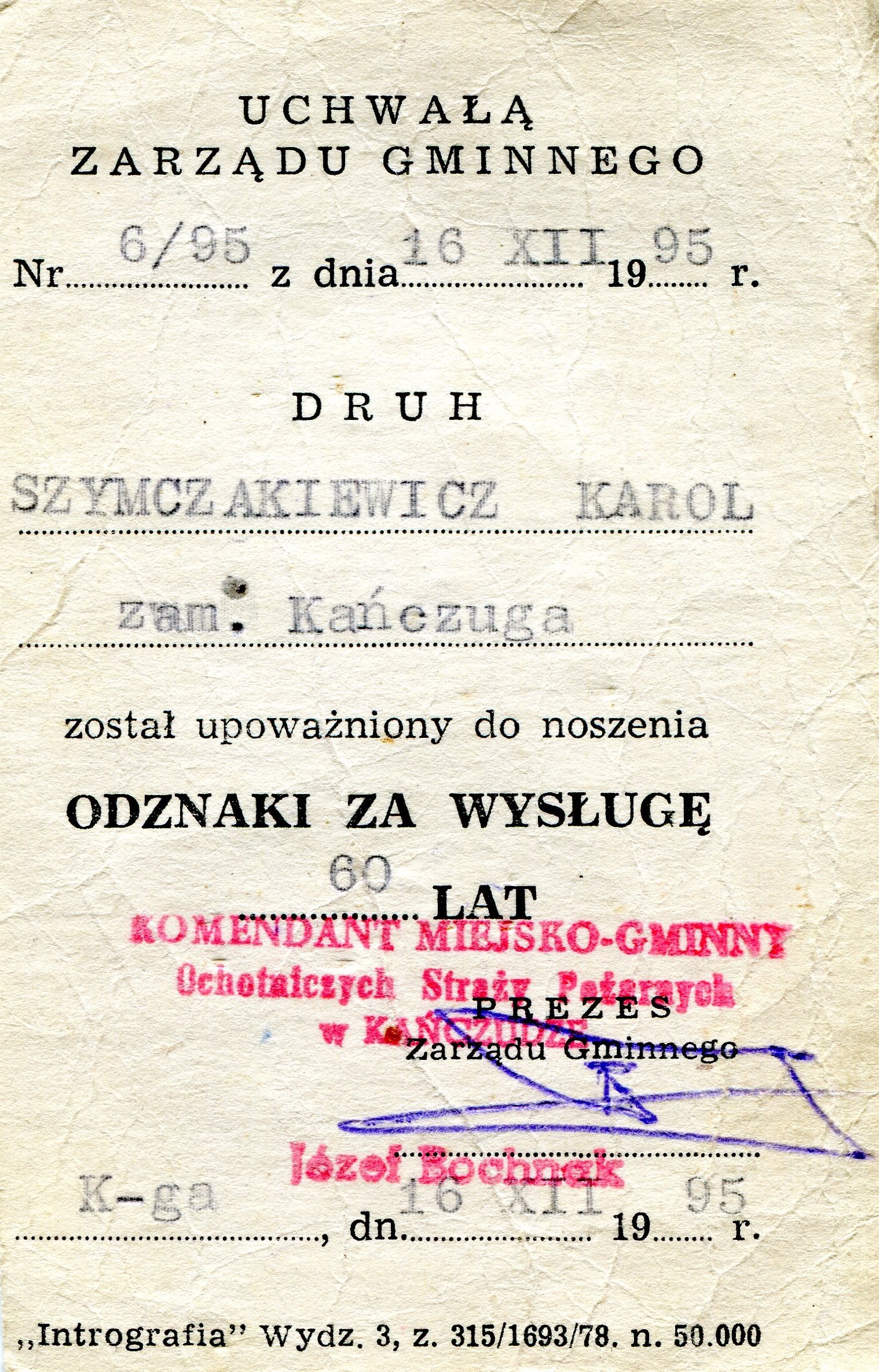 Legitymacja nr 10/95 z dn. 16 grudnia 1995 r. Kańczuga – Odznaka Za Wysługę 60 lat przyznana uchwałą Zarządu Gminnego Związku Ochotniczych Straży Pożarnych nr 6/95.