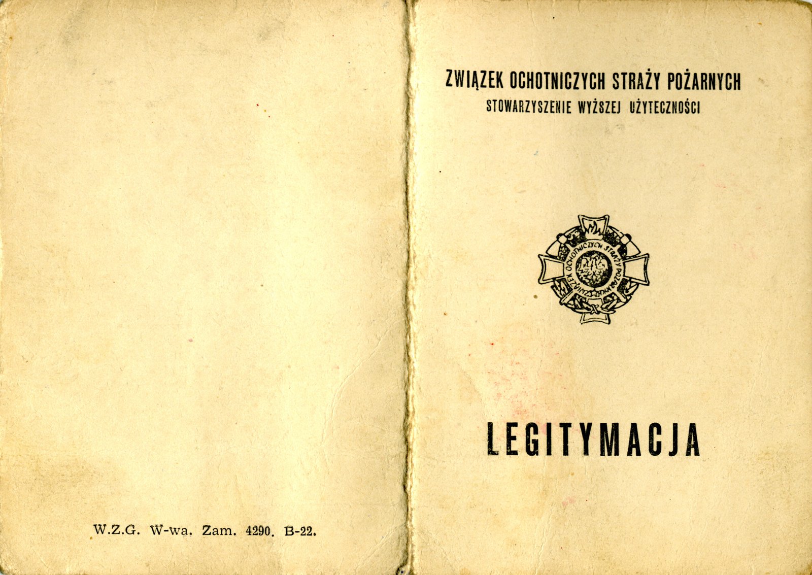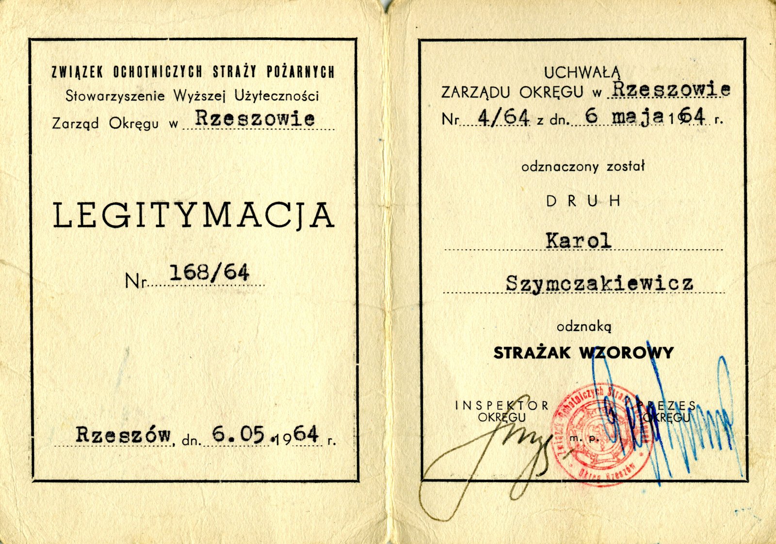 Legitymacja Nr 168/64 z dn. 06 maja 1964 r. Rzeszów – Odznaka Strażak Wzorowy przyznana uchwałą Zarządu Okręgu w Rzeszowie Związku Ochotniczych Straży Pożarnych.