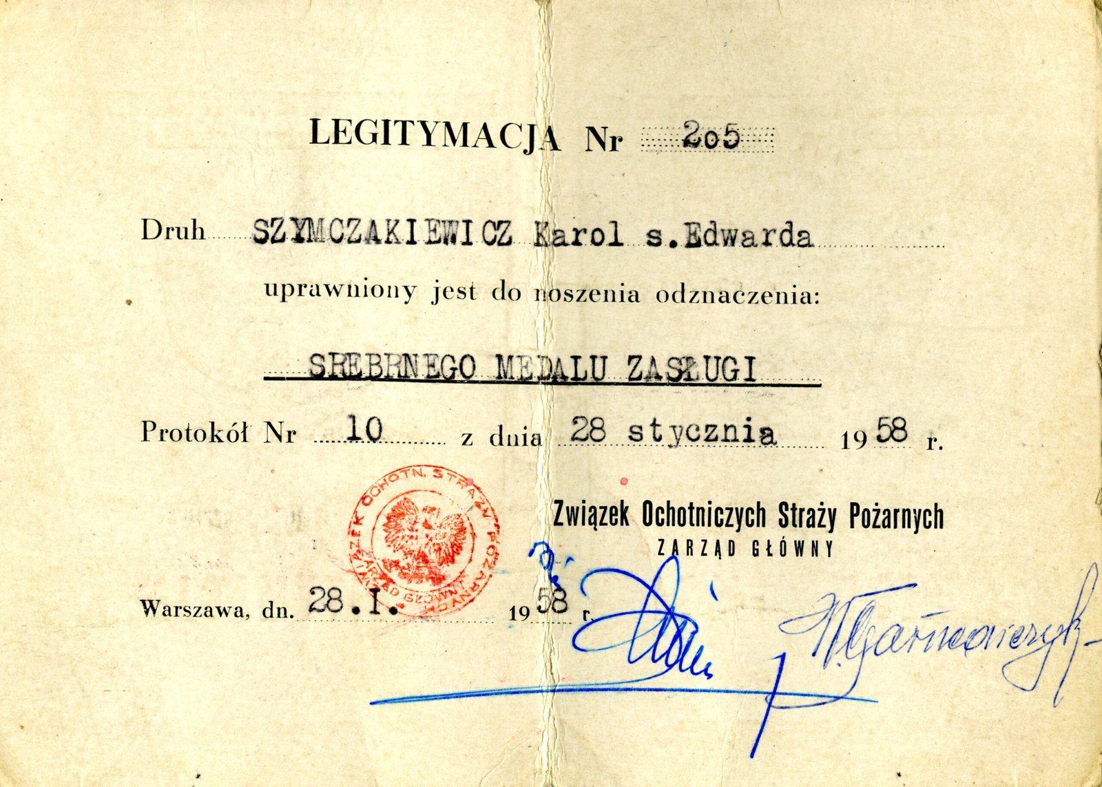 Legitymacja Nr 205 z dn. 28 stycznia 1958 r. Warszawa – Srebrny Medal Zasługi przyznany uchwałą Zarządu Głównego Związku Ochotniczych Straży Pożarnych w Warszawie.