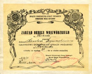Mój dziadek Karol Szymczakiewicz przez całe swoje dorosłe życie był aktywnym strażakiem, działającym w ramach OSP w Kańczudze. Z tego tytułu, wielokrotnie został odznaczony – zarówno przez struktury związane ze strażą pożarną, jak i organy państwowe. Oryginały poniższych legitymacji z wyjątkiem poz. w pkt. 2, 13, 14 zostały przekazane przez córkę Jadwigę do Izby Pamięci Ochotniczej Straży Pożarnej w Kańczudze w marcu 2011 r.