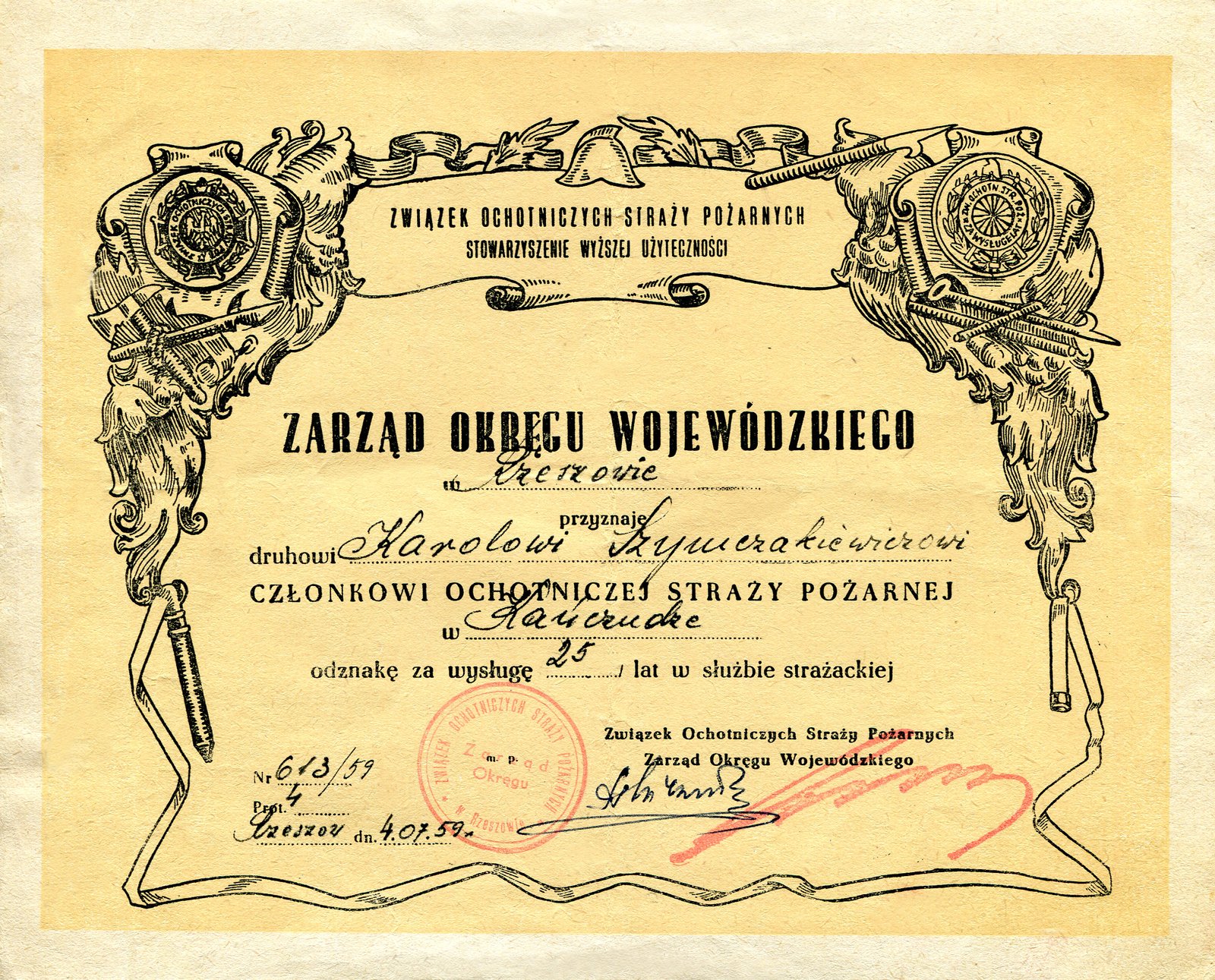 Dokument przyznania Nr 613/59 z dn. 04 lipca 1959 r. Rzeszów – Odznaka Za Wysługę 25 lat przyznana uchwałą Zarządu Okręgu Wojewódzkiego Związku Ochotniczych Straży Pożarnych.