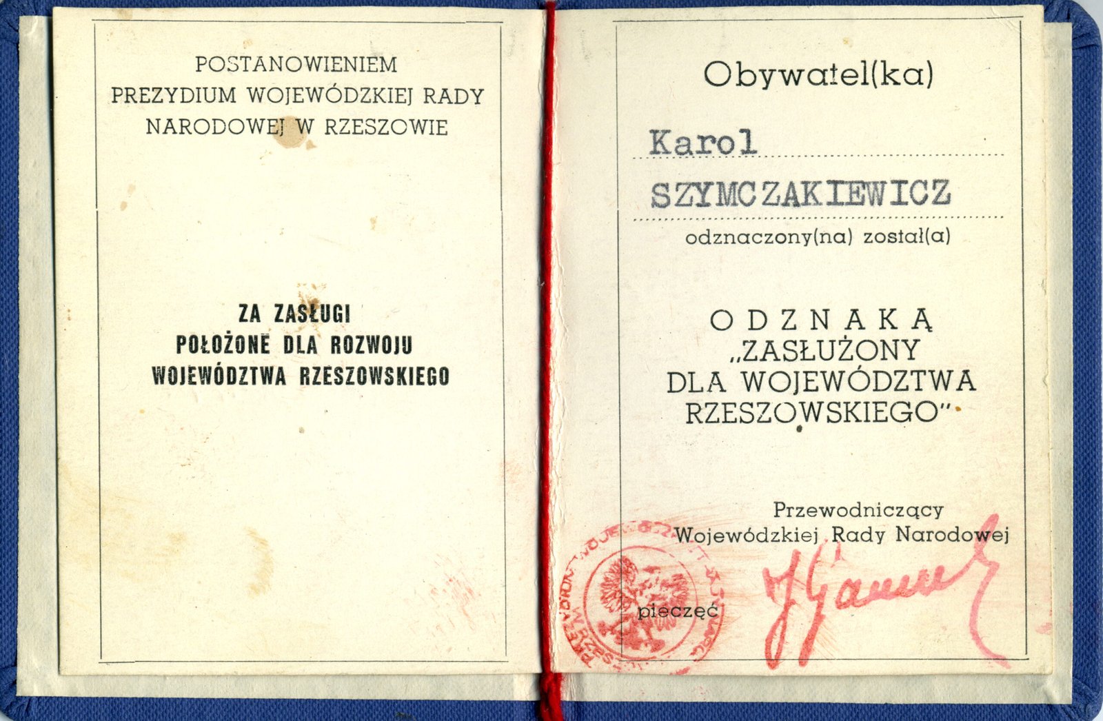 Legitymacja Nr 1304/74 – Odznaka Zasłużony Dla Województwa Rzeszowskiego przyznana postanowieniem Prezydium Wojewódzkiej Rady Narodowej w Rzeszowie.