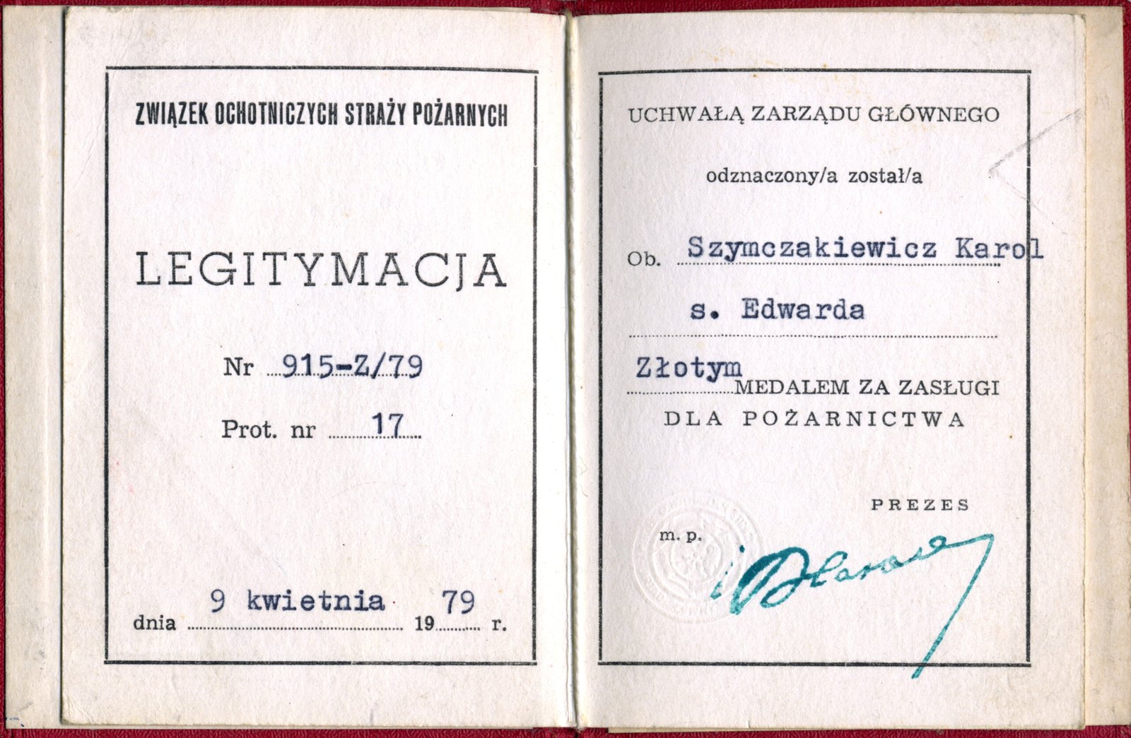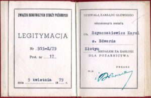 Legitymacja Nr 915-Z/79 z dn. 9 kwietnia 1979 r. – Złoty Medal Za Zasługi Dla Pożarnictwa przyznany uchwałą Zarządu Głównego Związku Ochotniczych Straży Pożarnych w Warszawie.