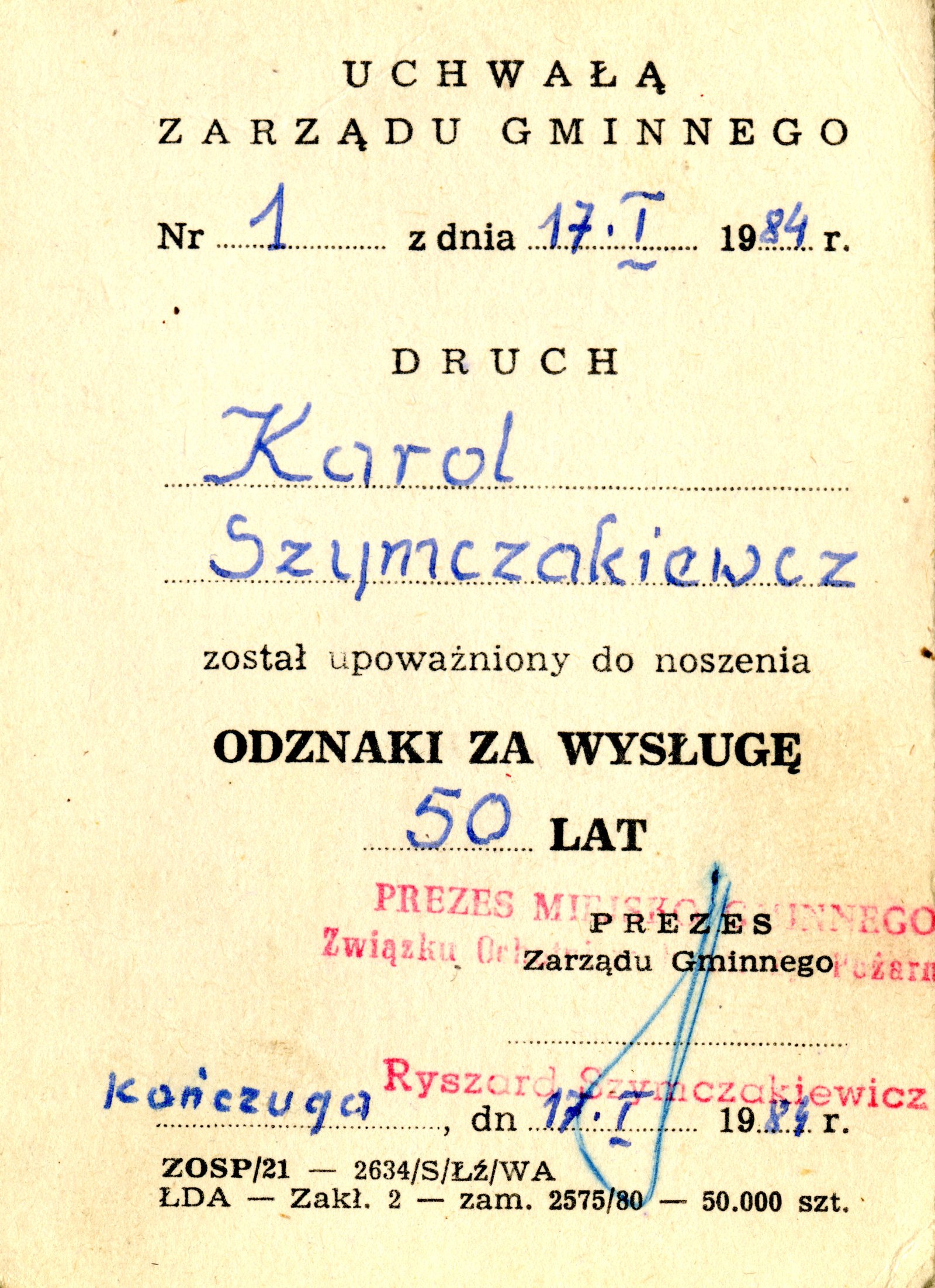 Legitymacja Nr 1 z dn. 17 stycznia 1984 r. Kańczuga – Odznaka Za Wysługę 50 Lat przyznana uchwałą Zarządu Gminnego Związku Ochotniczych Straży Pożarnych w Kańczudze.
