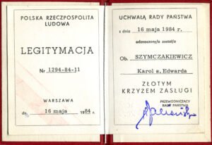 Legitymacja Nr 1294-84-11 z dn. 16 maja 1984 r. Warszawa – Złoty Krzyż Zasługi przyznany uchwałą Rady Państwa Polskiej Rzeczpospolitej Ludowej.