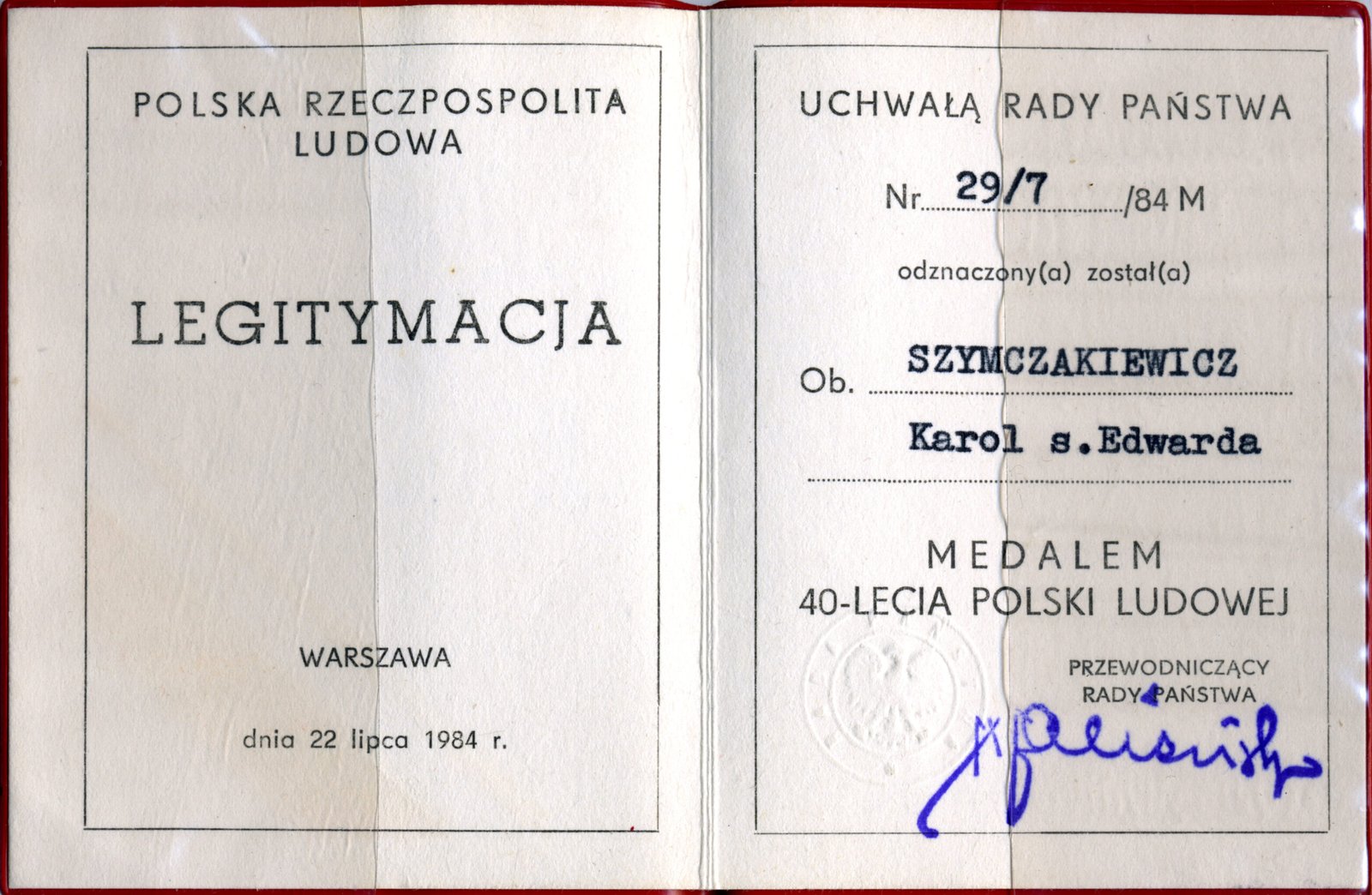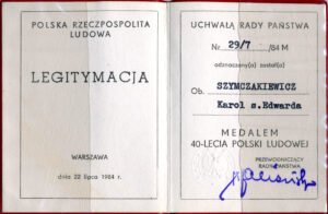 Legitymacja z dn. 22 lipca 1984 r. Warszawa – Medal 40-lecia Polski Ludowej przyznany uchwałą Rady Państwa Polskiej Rzeczpospolitej Ludowej.