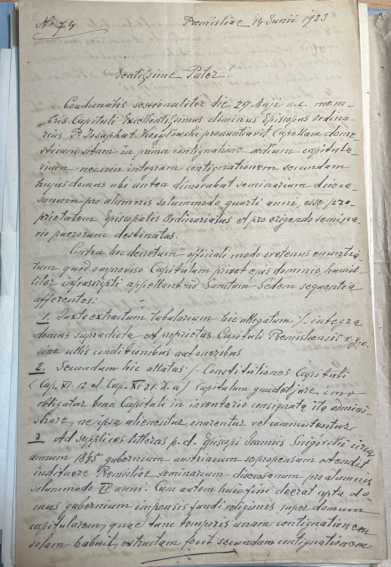 Zgromadzonym na posiedzeniu w dniu 29 maja b.r. członkom Kapituły Najdostojniejszy Pan Biskup Ordynariusz D[ominus]. Jozafat Kocyłowski ogłosił, że kaplica domowa położona na pierwszym piętrze [dosł. kondygnacji] budynków kapitulnych, a także całe drugie piętro tego domu, gdzie wcześniej przebywało seminarium diecezjalne dla alumnów tylko czwartego roku, są własnością Biskupiego Ordynariatu i przeznaczone na erygowanie seminarium dla chłopców [małe seminarium].