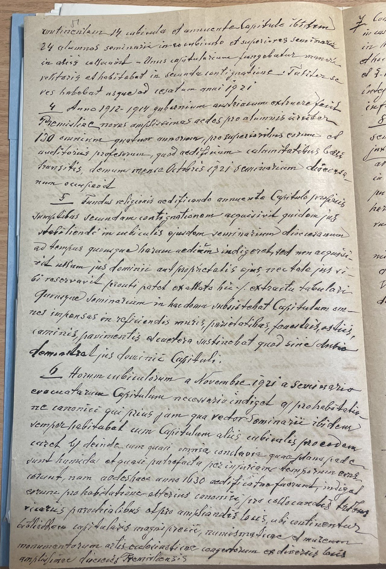 - Horum cubiculorum a Novembre 1921 a seminario evacuatorum Capitulum necessario indiget a/ pro habitatione canonici qui prius jam qua rector Seminarii ibidem semper habitabat cum Capitulum aliis cubiculis pro eodem caret b/ deinde cum quasi omnia conclavia quae plano pede sunt humida et quasi putrefacta per injuriam temporum evaserunt, nam aedes haec anno 1630 aedificatae fuerunt, indiget eorum pro habitatione alterius canonici, pro collocandis vicariis parochialibus et pro ampliandis locis, ubi continentur bibliotheca capitularis magni precii, numismatica et museum monumentorum artis ecclesiasticae congestorum ex diversis locis amplissimae dioecesis Premisliensis.