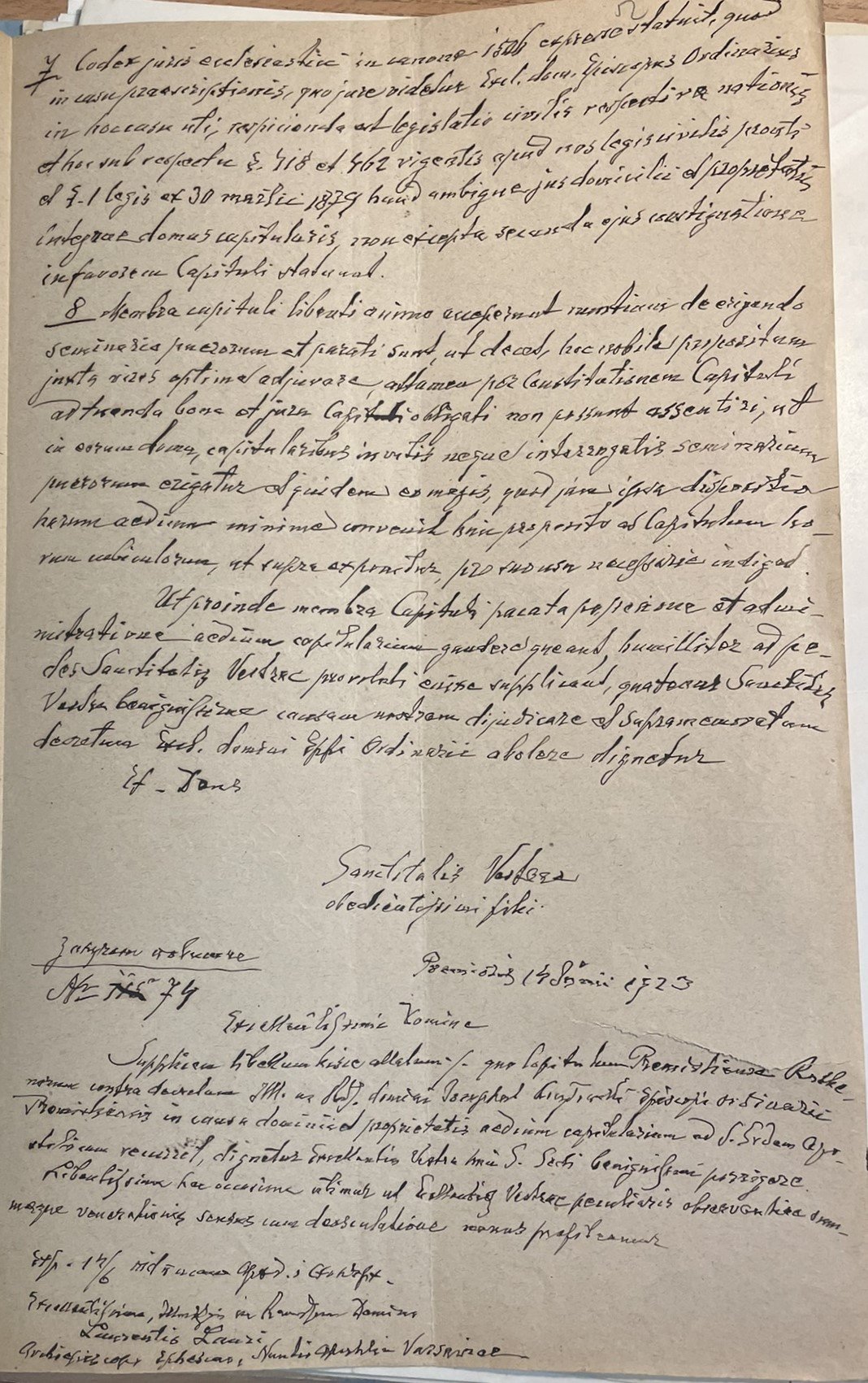 Aby zatem członkowie Kapituły spokojnym posiadaniem i administracją budynków kapitulnych cieszyć się mogli, pokornie do stóp Waszej Świątobliwości upadając, usilnie błagają, ażeby Wasza Świątobliwość najłaskawiej sprawę naszą rozsądzić i wyżej wspomniany dekret Najdostojniejszego Pana Biskupa Ordynariusza znieść raczył.