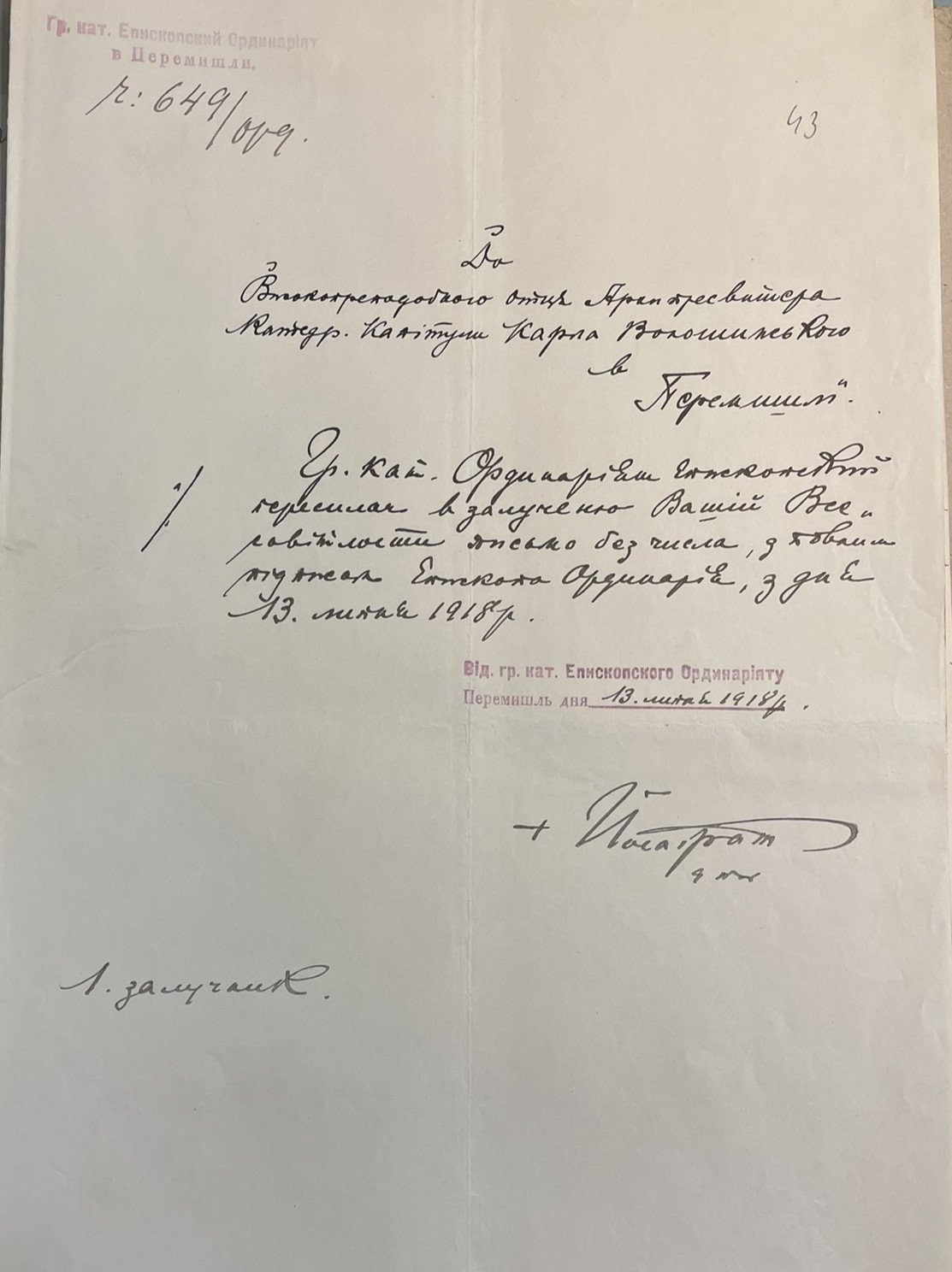 Гр. кат. Ординаріят Епископский пересилає в залученню Вашій Всесвітлости письмо без числа, з подання тутеш. Епископа Ординарія, з дня