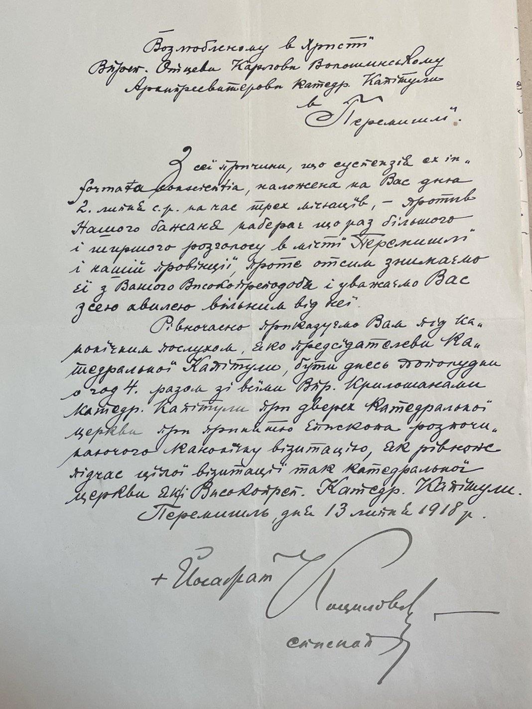 Równocześnie nakazujemy Wam pod kanonicznym posłuszeństwem, jako Przewodniczącemu Katedralnej Kapituły, być dzisiaj po południu o godz. 4. razem ze wszystkimi W[ielebny]mi Kanonikami [Kryłoszanami] Katedr[alnej] Kapituły u drzwi Katedralnej cerkwi przy przyjęciu Biskupa rozpoczyna-