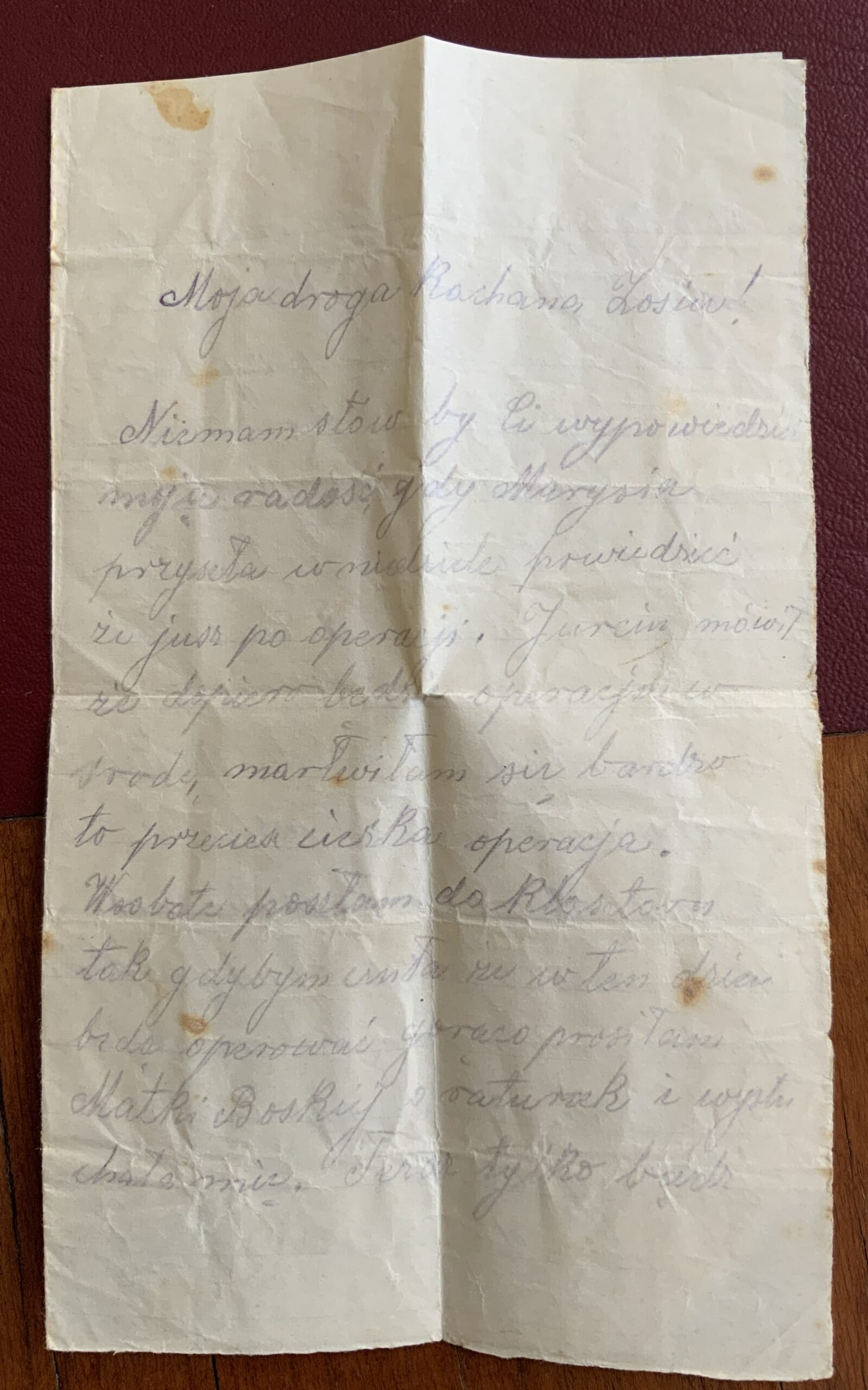 Niemam słów, by Ci wypowiedzieć moją radość, gdy Marysia przyszła w niedzielę powiedzieć, że już po operacji. Jurciu mówił że dopiero będzie operacja w środę, martwiłam się bardzo to przecież ciężka operacja. W sobotę poszłam do klasztoru tak gdybym cniła że w ten dzień będą operować gorąco prosiłam Matki Boskiej i ratunek i wysłuchała mie. Teraz tylko bądź spokojną jusz po tym najgorszym mówił Jurciu że tylko jeszcze jedna noc będzie przy Tobie czuwać pielęgniarka, możeby Zosiu chociaż 2 noce jeszcze była z Tobą. Jak Ci Pan Bóg pozwoli wrócić to Cię tutaj zabieramy na jakiś czas u Mami będziesz miała spokój jakoś będziemy się wspierać razem. Nowego u nas nic ma zni w może przyszłym tygodniu będą niemożemy się jusz doczekać. Ściskamy Cię i całujemy wszyscy
