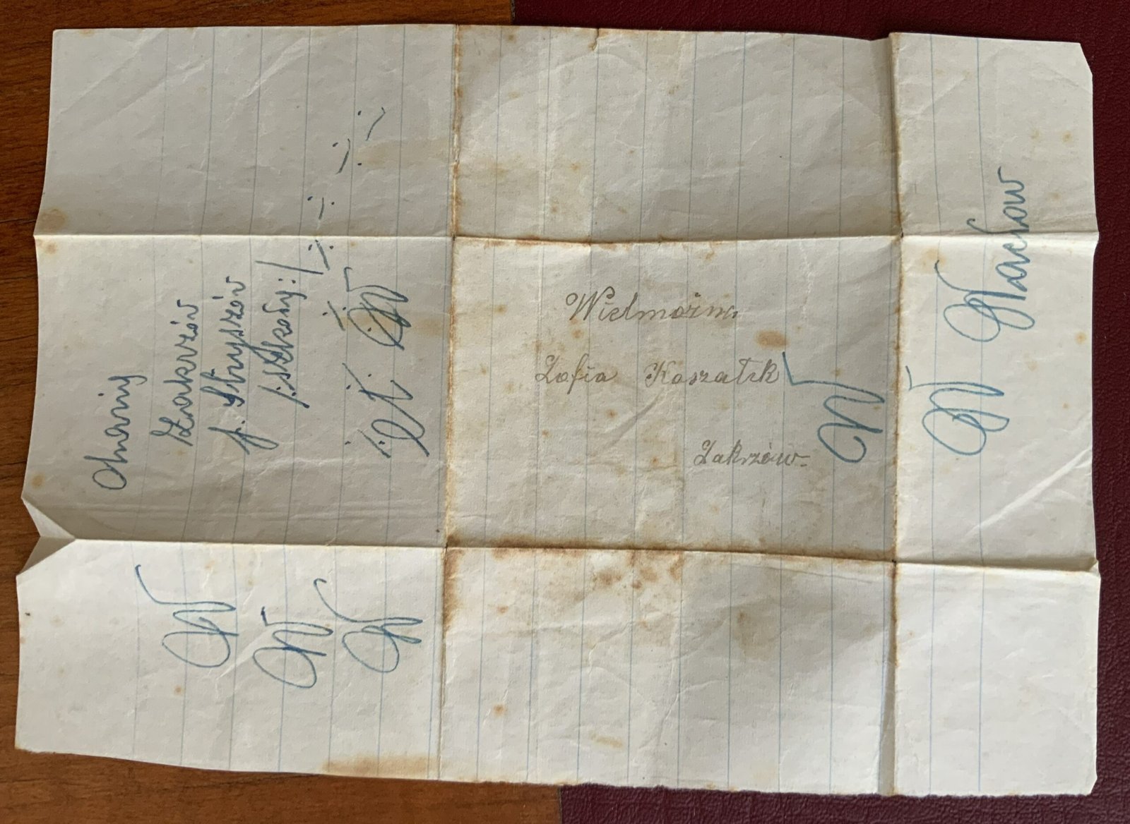 W archiwum cioci Eli Login zachowały się dwa niedatowane listy, napisane przez moją 2x prababkę Ludmiłę Leśniak do córki Zofii Koszałek. Z treści wynika, że listy musiały zostać napisane, gdy ciocia Koszałkowa mieszkała jeszcze w Zakrzowie; zresztą jeden z nich jest tak właśnie adresowany. Dom na Błażkówce 7, do którego później się przeprowadziła, został wybudowany w latach 30. XX wieku. W lista wspomniany jest syn, Jerzy Koszałek, który urodził się w roku 1919 – jego babka Ludmiła pyta, czy może przyjechać. Musiałby być już pewnie kilkunastoletnim chłopcem, więc zapewne listy zostały napisane na początku lat 30.