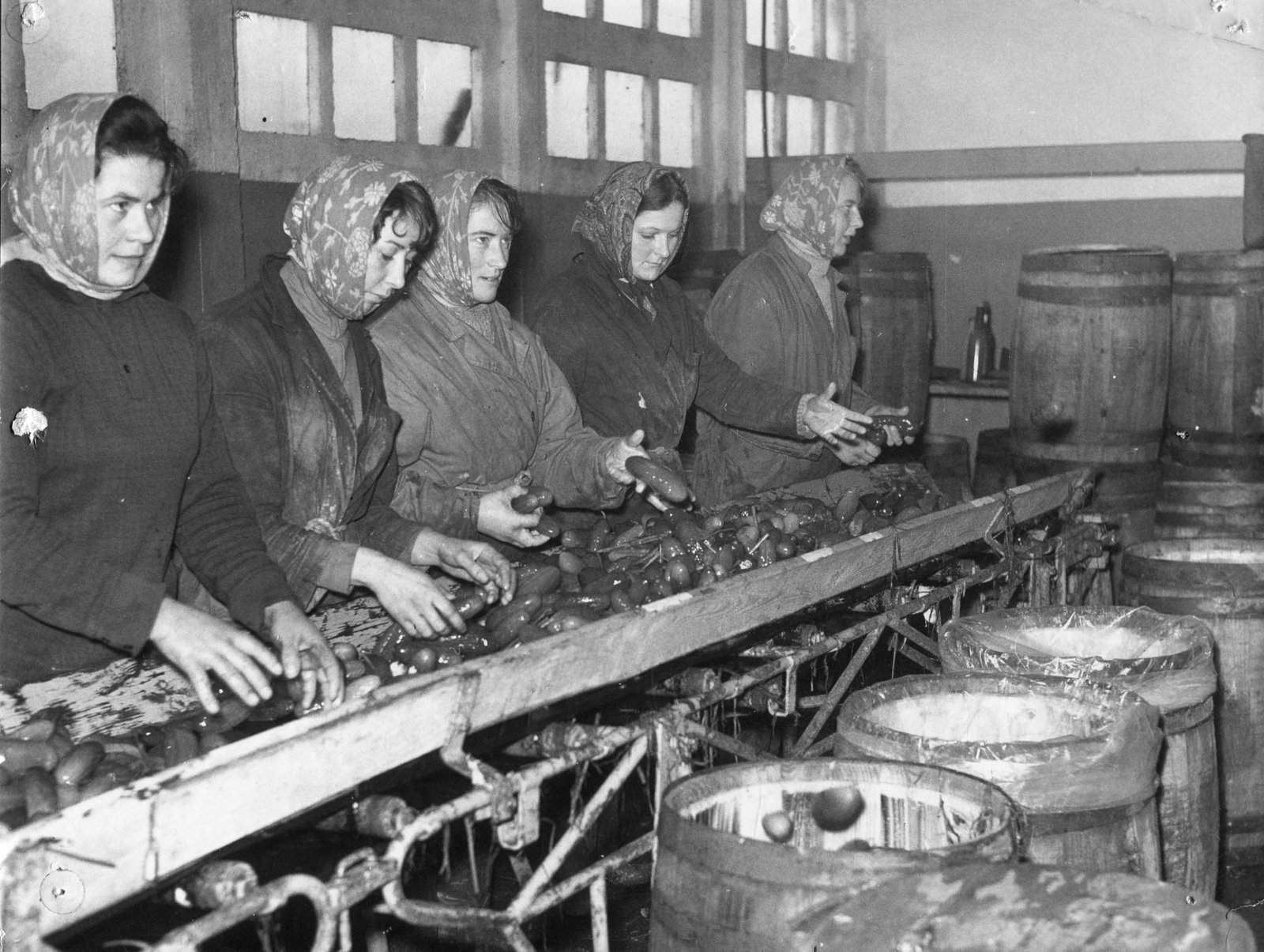 Pracownice kwaszarni ogórków, lata 60., Kańczuga Błonia