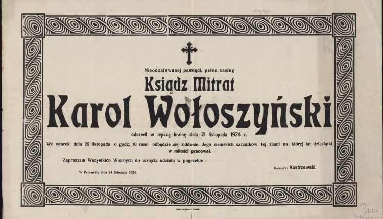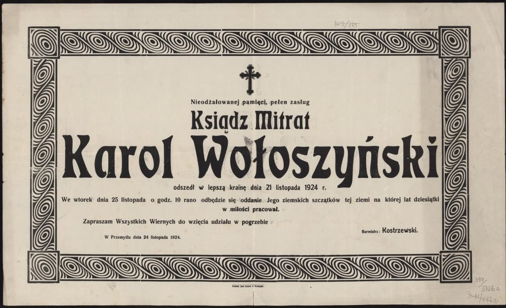 14-03-2021: Dzięki pomocy naszego czytelnika, pana Artura, mamy skan metryki zgonu mitrata Wołoszyńskiego, który potwierdza, że faktycznie chodzi o Karola. Metryka znajduje się w księgach parafii greckokatolickiej Przemyśla dla przedmieść Wilcze Przekopana. Jako przyczynę śmierci w wieku 79 lat podaje „marasmus” czyli wyniszczenie.
