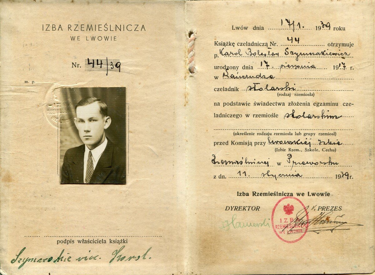 Egzamin czeladniczy dziadek Karol złożył 11 stycznia 1939 r. , o czym zaświadczała Komisja Egzaminacyjna Czeladnicza dla zawodu stolarskiego przy Izbie Rzemieślniczej we Lwowie.