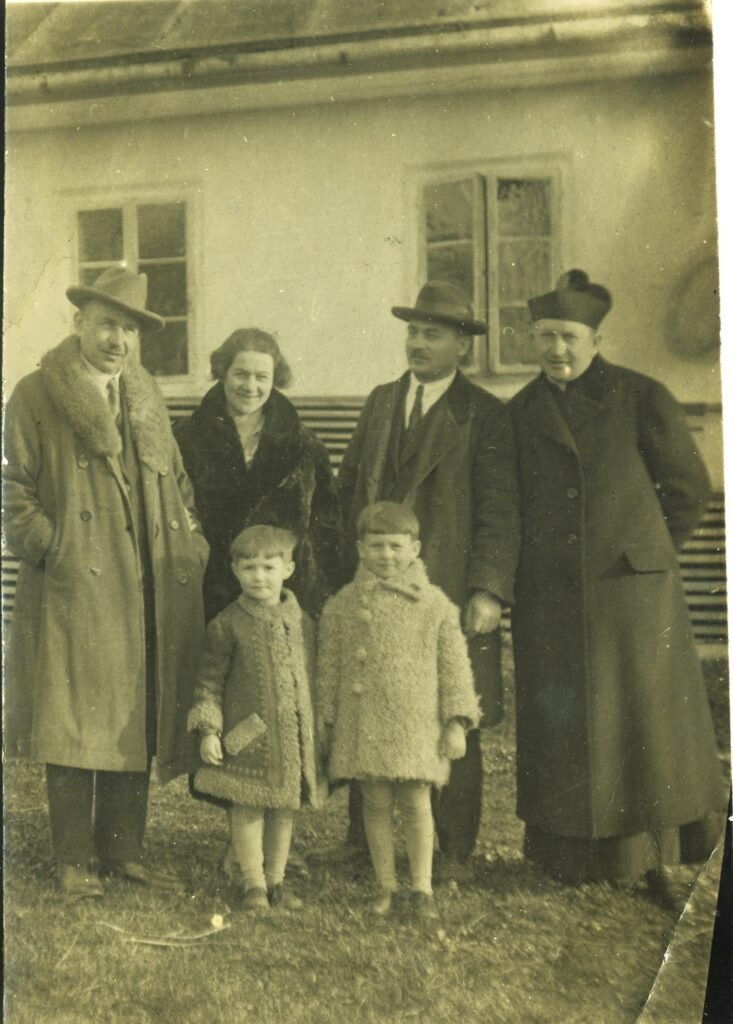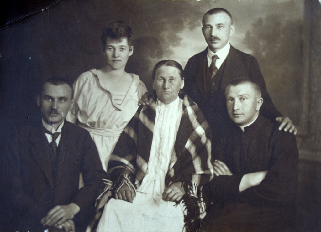 Tomasz (brat) i Maria Zaborowscy, Piotr Zaborowski (brat), ks. Augustyn Zaborowski, prawdopodobnie córki Tomasza Anna i Krystyna. Koniec lat 20. XX w. Źródło: archiwum rodziny Sosin.