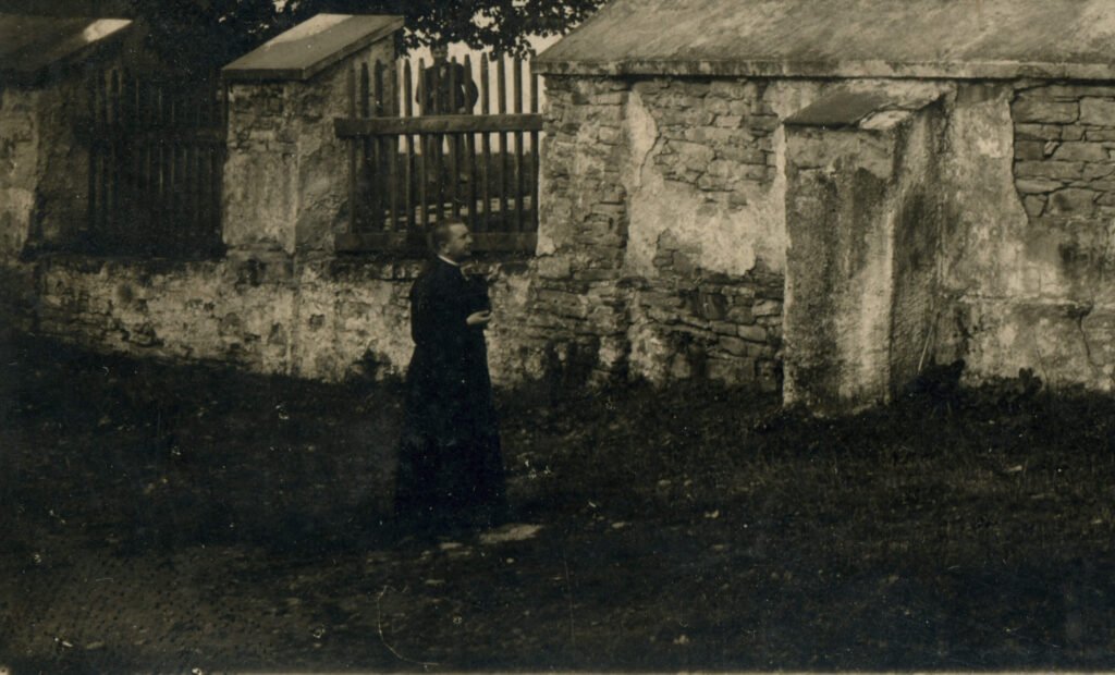 Ks. Augustyn przy murze kościoła w Siedlisku k. Bobowej 1939 r. Źródło: archiwum rodziny Sosin.