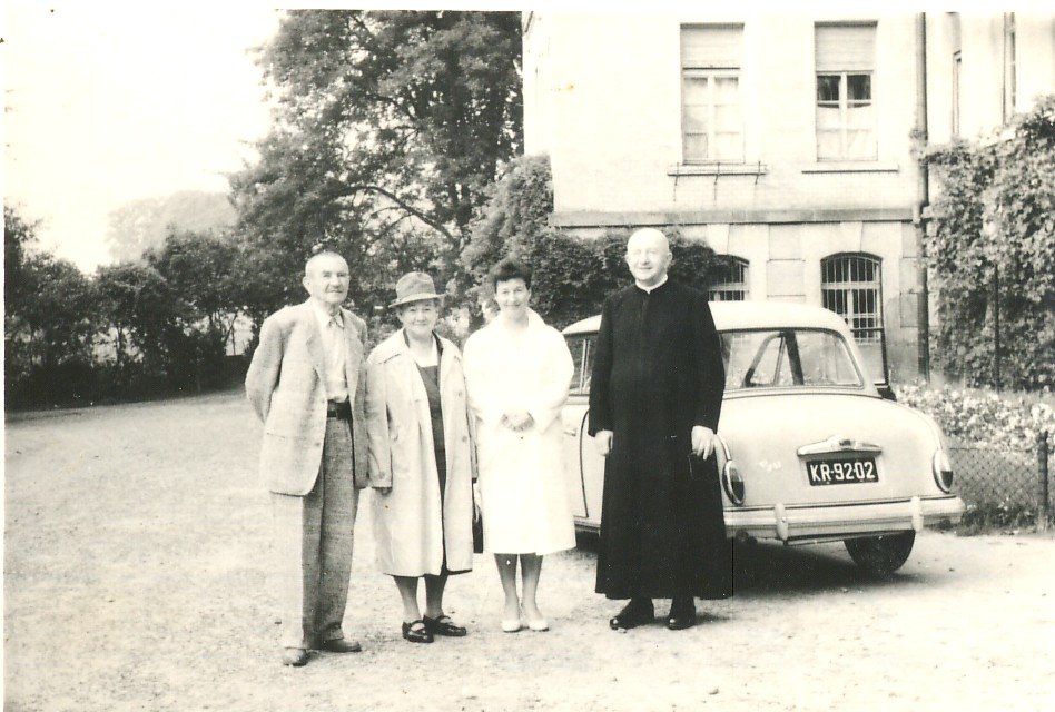 Rodzinne odwiedziny. Stoją od lewej: Tomasz Zaborowski (brat), Maria Zaborowska (bratowa), Teresa Zaborowska (bratanica), ks. Augustyn Zaborowski. Klasztor w Zbylitkowskiej Górze. Źródło: archiwum rodziny Sosinów.